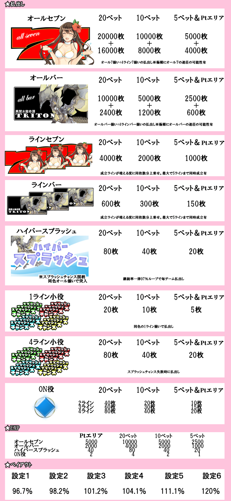 オール7などの役によりEXPが加算されます。 さらにポイントエリアでは毎ベット(Pt)分のEXPが加算されます。 -